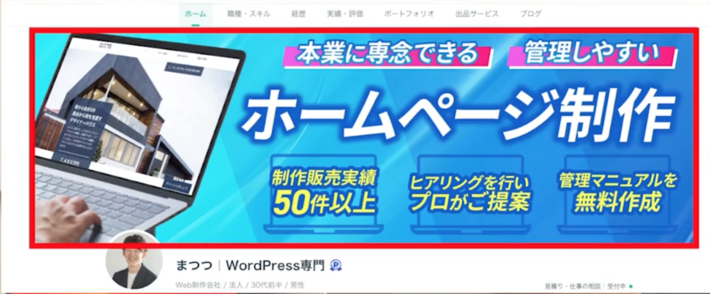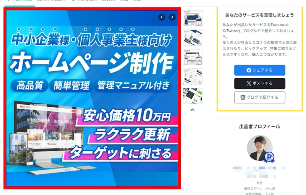 例えばこのように「ホームページを制作します」というサービスを出品しておくと、
