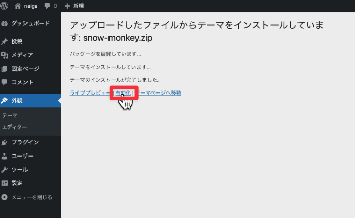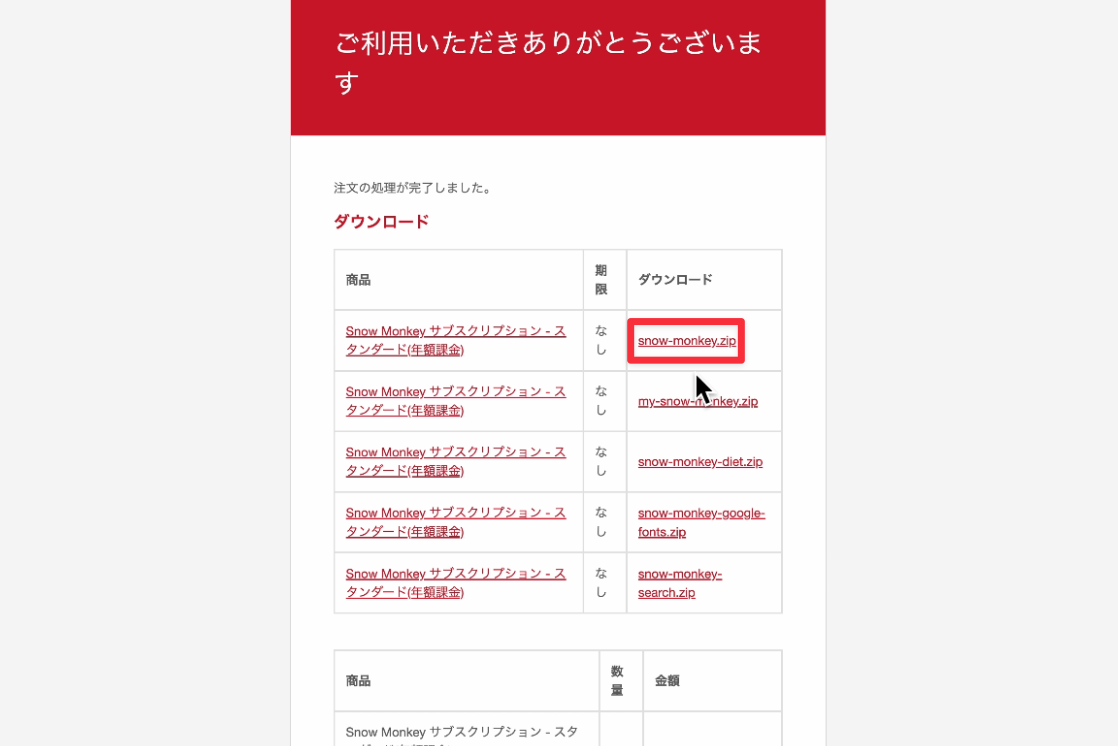 購入できたら「snow-monkey.zip」というテーマファイルがメールで届くので、保存しておきましょう。