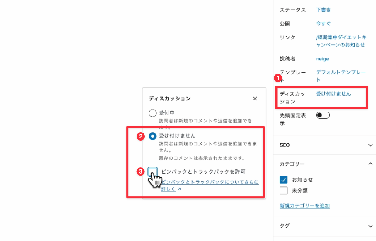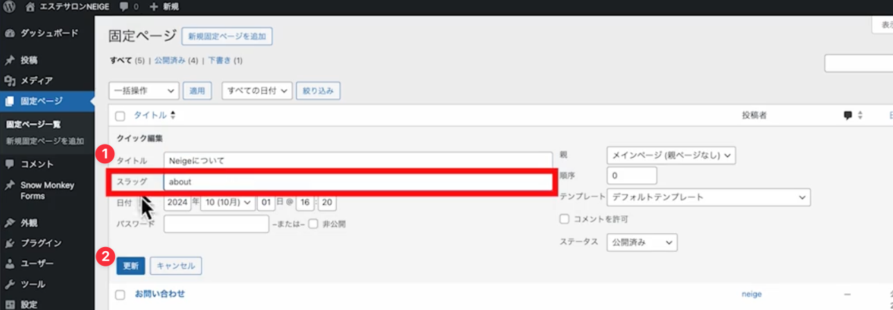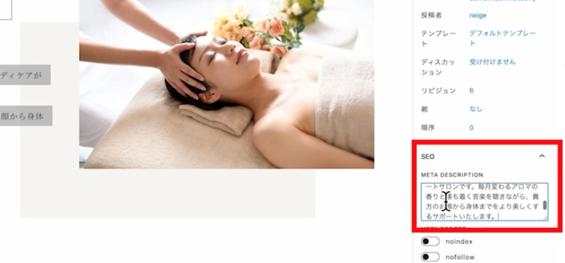 メタディスクリプションは各ページの編集画面の右側のメニュー。