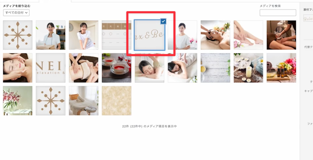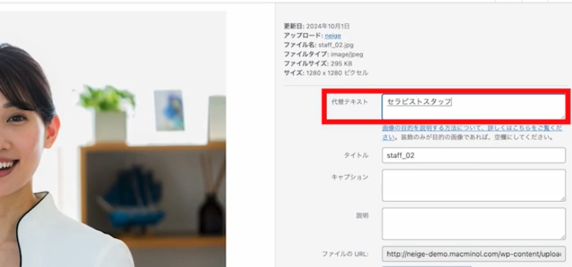 alt属性はメディアライブラリから画像を選択して「代替テキスト」から設定することができます。