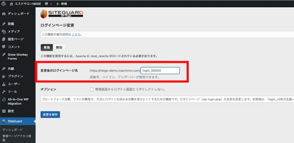 こちらのログインページ変更からリンクは自由に変更することができるので、忘れないものに変更しておきましょう。