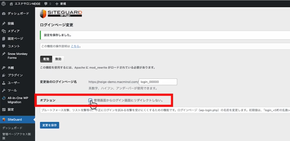 ここにチェック入れておかないとwp-adminでもログイン画面に飛んでしまうので、ログインURLを変更する意味がなくなってきます。
